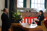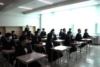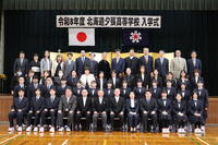 新入生19名は緊張の面持ちで体育館へと入場しました。入学が許可された後、新入生代表の外尾幸路さんが「中学校で共に学んできた仲間、そして高校で新しく出会う仲間とともに、困難に立ち向かい、乗り越え、その経験を自分達の糧にできるよう、努力していきます。」と力強く宣誓しました。19名のこれからの輝かしい活躍を期待しています。