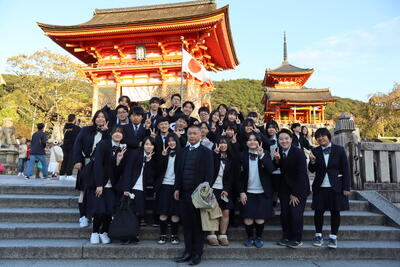 朝9時、天気にも恵まれた中、全員が元気に出発しました。班ごとに立てた計画をもとに、京都市内の施設等を見学後、宿泊予定の大阪のホテルを目指します。