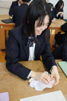 生徒たちは「話題や相手に興味を持たないと質問はしづらいので、しっかり話を聞こうと思った。」「何を質問されるか、少し緊張した。事前に質問が分かっていると用意できるから、あらかじめ質問を相手に渡しておくと良いと思った。」「どの部分を使って記事にするか悩む。要約の難しさを実感した。」など、学びの多い時間となりました。