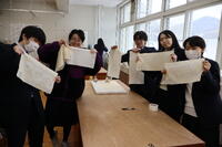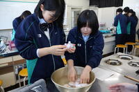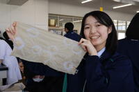 現代の国語の単元「社会と関わる」において、『森で染める人』(著:鈴木菜々子)を学習しました。この教材は、作者が染織を通して自己表現を可能にする技術とものづくりの意味を見いだすこと、染織の環境継承のために自然の中で暮らしながら「自分」を見出だすことが主に描かれています。数ある職業の中から染織家による「草木染め」がどのようなものかを知るため、今回はタマネギの皮とコーヒーの粉を使用した「草木染め」に挑戦しました。完成した布は、3年次の家庭総合で巾着にする予定です。